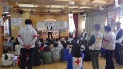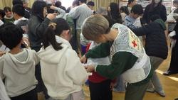 今回は、日本赤十字社よりボランティア奉仕団の皆さまをお迎えし、三角巾を使った応急処置について専門的なご指導をいただきました。 子どもたちは真剣な表情で話を聞き、実技にも意欲的に取り組んでいました。