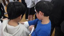 プログラムの中には、給食で使う白衣の着方を教えてあげる場面もありました。園児の目線に合わせて説明したり、そっと手を添えて手伝ったりと、1年生なりの気遣いと成長が感じられる時間となりました。