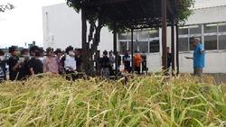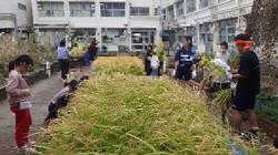 また、3・4時間目には、5年生が稲刈りを行いました。田おこしの段階から関わってくださっている、はまぎん こども宇宙科学館の石橋先生も応援に来てくださり、釜の持ち方から刈り方まで、丁寧にご指導いただきました。