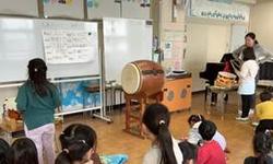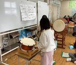音楽の学習で、音楽室にある和太鼓と締太鼓でおまつりの音楽を作りました。初めて太鼓にふれる子どもたちも多く、その大きな音や響きに驚いた様子でした。ばちの持ち方を確かめ、自分で音を出したり、リズムを作ったりすることに楽しさを感じていました。