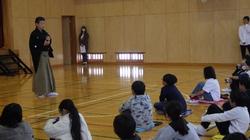 また、「かまえ」や「すり足」など、能独特の動きにも挑戦し、身体の使い方や所作の美しさを学びました。2時間の学習を終えた子どもたちは、いつもより背筋が伸び、凛とした姿勢で教室に戻ってきました。日本の伝統文化に触れる貴重な機会となり、心と身体の両面で深い学びを得ることができたようです。