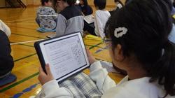 授業では、先生から能の700年にわたる歴史や、所作の意味について丁寧にご指導いただきました。子どもたちは、演目「高砂」の一節を謡う場面では、一人ひとりのタブレット端末に表示された歌詞を見ながら、先生の声や拍子に合わせて懸命に声を出していました。初めての体験ながらも、真剣なまなざしで取り組む姿が印象的でした。