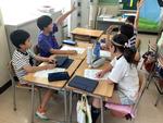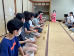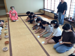そして、お茶菓子をいただいた後に、お点前を丁寧に教えていただきました。茶せんを使って抹茶を点てることが難しいようでした。子どもたちは、「抹茶がおいしかった。」「懐かしかった。」と、それぞれ茶道の魅力を感じていました。