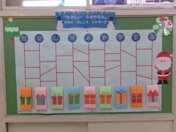 保健室前の掲示板には、みなさんに「楽しい冬休みを過ごしてほしい」という願いを込めて、『冬の健康メッセージあみだくじ』を飾っています。