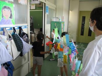 1年生の廊下には願い事が書かれた短冊が飾られています。