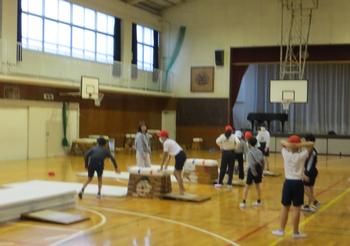 頭の後ろを跳び箱に着けるようにして前転することなどを
