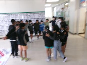 音楽室前のホールでは、低学年リレーのメンバーが集まり、先生方の熱い思いを受け取りながら、当日の流れを確認していました。