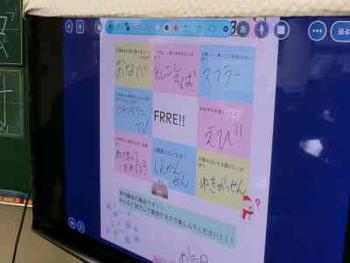 ビンゴカードの各マスには、「善部小といえば?」「おせちの具といえば?」など、冬や学校にちなんだお題が書かれています。