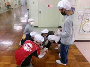 給食の配膳が終わる頃、職員室を出て給食室前を通りかかると、6年生が何やら集まっていました。