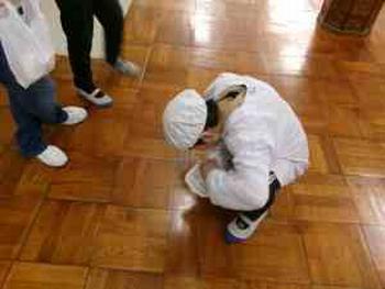 近づいてみると、給食配膳の際にこぼれてしまった汚れを、黙々と拭き取っているところでした。