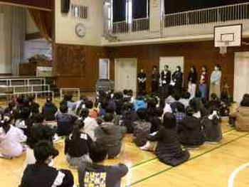 今朝、体育館で6年生に向けた小学校生活最後の読み聞かせが行われました。