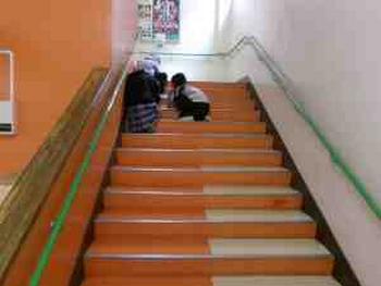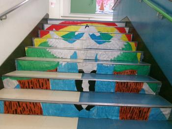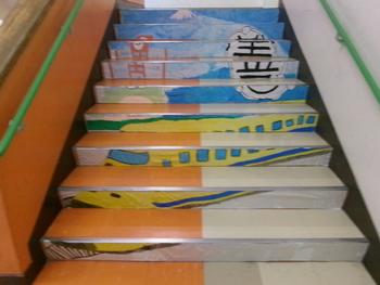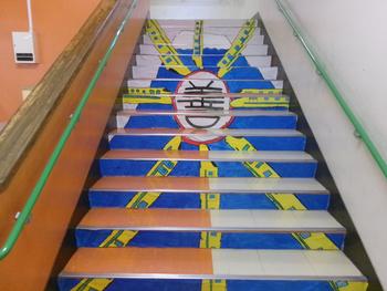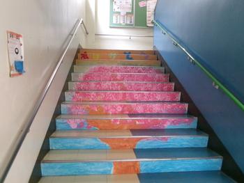 これまで話し合いや制作を重ね、今日はいよいよ完成した階段アートを校舎内に貼り付けました。
