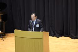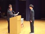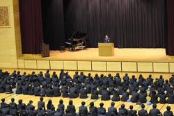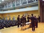 修了式の前には表彰式が行われましたが、壇上で表彰を受けた生徒に対する全校生徒、職員からの温かい拍手が印象的でした。表彰の冒頭には京三製作所様から本校に寄贈していただいている3Dプリンタを利用した校内コンテストの表彰があり、京三製作所様から3名の方がプレゼンターとして来校してくださるとともに、代表して島添様による全校生徒への講話もいただきました。