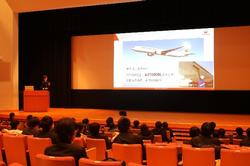 講演では、パイロットの仕事や飛行機の構造、飛行機がなぜ飛ぶのかといった航空工学の基礎について、実際の運航経験を交えながら分かりやすく解説していただきました。揚力や空気の流れ、機体の重さとバランスの考え方、フライト中に行われる判断や計算、雲や風などの気象を読みながら行う安全運航などについて、理論と実践を結びつけた内容に、生徒たちは、普段の授業で学んでいる物理の知識が、実際の飛行機の運航に直結していることを実感している様子でした。