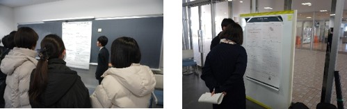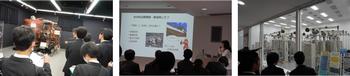 物質・材料研究機構(NIMS)では研究施設の様々な部屋を実際に見学することによって研究者の様子や大規模な実験装置を目にすることができました。そこでは繊細な装置を使う際の注意点を教えていただき、カニやハエなどのヒト以外の生物を参考にした面白い研究の資料を見せていただきました。身近なものから新たな素材を発見するといった内容が多く、生徒にとっても身近に感じることができたようでした。