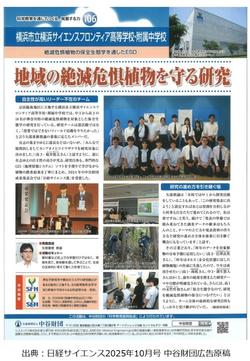 令和7年2月21日(金)日本大学理工学部駿河台校舎において、自然環境復元学会第25回全国大会が行われ、本校からはサイエンスラボ「地域の課題解決プロジェクト」で研究を行っている、「箱根・丹沢の保全生態学」チーム(附属中学生6名、高校生5名)が参加し、口頭発表を行いました。このチームは箱根や丹沢において希少植物の調査を行い、調査データをもとに生息適地モデルを構築しようと取り組んでいます。その活動状況を口頭発表し、特別賞を受賞しました。まだ生息適地モデルの作成まで至っていないため、参加した生徒たちは「今後も継続して研究を進め、データを多く集めるために調査を重ねていきたい。」と言っていました。