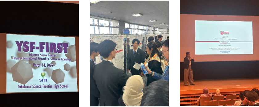 3月14日(土)本校において、中高生の英語研究発表会、YSF-FIRSTを行いました。YSF-FIRSTは中高生を対象とした英語の研究発表会です。当日は生徒主体で運営し、ポスター発表はもちろん司会・神鋼もすべて英語で行います。本校2年次の課題研究授業サイエンスリテラシーII(SLII)の優秀者および附属中学校3年生をはじめ、栃木県立大田原高等学校、サンモールインターナショナルスクール、奈良県立清翔中学・高等学校が参加しました。また、マレーシアのプトラ大学と行っている国際共同課題研究に参加している茨城県立並木中等教育学校、鹿児島の池田学園池田高等学校、本校の生徒は、10か月に及ぶ共同研究の成果をプトラ大学の学生と一緒に発表し、全57件の研究発表会となりました。審査は留学生30名が投票審査を行うなどして、8つの賞を授与しました。