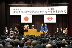 大きな拍手に包まれ、堂々と歩む卒業生の入場から始まりました。地域の方々も含め、多くの来賓の方々が列席し、在校生として高校2年次生が見守る中で行われました。学校長式辞では、「挑戦し続ける姿勢を、生涯大切にしてほしい」、「皆さんのこれからの歩みを支える大切な姿勢として、『感謝する心』を持ち続けてほしい」という2つことが卒業生に藤本貴也校長から伝えられました。また、常任スーパーアドバイザーの浅島誠先生からの祝辞、在校生代表の先山淳さんによる在校生の言葉と続き、卒業生の言葉では根本快さんが立派に代表としての役目を果たしました。その中では在校中の周囲の方からの支援への感謝や思い出、これから歩んでいくことの決意をこめた言葉が示されました。最後には、年次の仲間と歌う最後の校歌を卒業生が思いを込めて歌い、式を締めくくりました。これからの卒業生諸君のさらなる活躍を期待しています。ご卒業おめでとうございます。