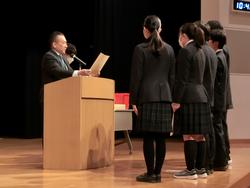 終業式では校長講話、生活保健指導部主任から冬休みの生活についての注意事項がありました。校長講話では「蒼煌祭」、「研究発表」等でそれぞれの挑戦が見られ、壁を乗り越えようとする姿があったことを例にされ、挑戦にともなう人との「つながり」の大切さについてお話がありました。後半には高校3年次生の生徒たちに向けてメッセージを述べました。これまで進路実現に向けて、朝学習、授業に向かう態度や自習室で真剣に学習に取り組む姿への心からの敬意を示し、努力し続ければ結果は必ずついてくると激励しました。最後に、来たる新年が素晴らしい一年になることを願い、式辞を終えました。