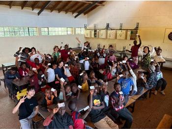 カードを受け取った子どもたちには、お土産として持参していた「たべっ子どうぶつ」のビスケットか、「ハッピーターン」のおせんべいのどちらかを選んで取ってもらいました。初めて食べる日本のお菓子にドキドキしながら手を伸ばす姿が印象的でした。