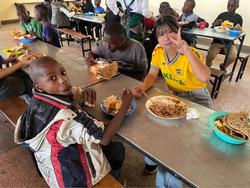 そして場所を移動し、ムディボさんと、ムディボさんのアートスクールに通う3人の子ども達、ボランティアの方も一緒にランチを食べました。初めはお互いに緊張の面持ちでしたが、自己紹介したり、話のきっかけをつくってもらったりしたことで、子ども達に笑顔が見えるようになりました。緊張も解けてきた頃、ちょうどヤギ肉のニャムチョマ(焼肉)が出てきました。私たちに、ウガリ(白とうもろこしやキャッサバの粉を練り上げて作られる主食)の食べ方を教えてくれながら、美味しそうに子ども達が肉を頬張る姿に、こちらも嬉しくなった一方で、「こんなお肉はめったに食べないんだ」という一言に、胸が苦しくなりました。