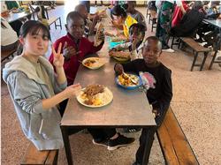 続いて昼食の時間となりました。この日のメニューはご飯に、じゃがいもとにんじん、牛肉の煮物が添えられ、チャパティ(ナンを薄くしたようなパン)が一緒に盛り付けられていました。食事中には、「日本ではどんなものを食べるの?」「ウガリは食べるの?」といった質問が飛び交い、日本の食習慣にも興味津々の様子でした。