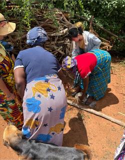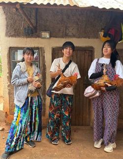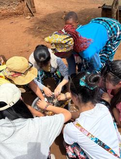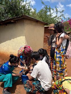 いよいよ昼食作りです。村のリーダーエスタさんが、8カ月大切に育てた鶏を3羽、私たちのために提供してくれました。生徒たちは、2月にケニアに来た先輩たちから話は聞いていたものの、いざその場面になると泣いてできない生徒、呆然と立ち尽くす生徒もいました。そんな中、3人の生徒が果敢に挑戦し、苦戦しながらも村の人に助けられて実践することができました。