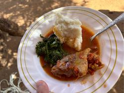 集会所に戻ると、先ほど捌かれたチキンがすでに調理され、昼食の準備が整っていました。命をいただくことの尊さや、料理を作ってくださった方々への感謝の気持ちを胸に、ひと口ひと口味わいました。