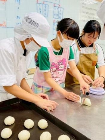 午前中は飲食店経営科のBaking Classesの授業へ参加させていただきました。昨日同様、曾文の生徒はゼロからのクリームバターパン作りを熱心に教えてくれて、みな楽しそうに実習を行いました。朝9時から作り始めてパンが焼きあがるのは正午過ぎ。焼きたてのパンをすぐに食べることはできませんでしたのでおやつ用に持ち帰りました。