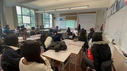 最初にY校の紹介をしました。チャーチル校の生徒はY校にある学科の違いに興味津々でした。
