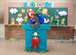 行事サポート委員会では、バザーとフォトスポットを出店しました。フォトスポットはマリオの煙突と花の三日月の2つを製作して、文字通り賑わいに花を添えました。