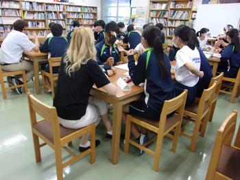 9月1日(金)、3年生のSEPROを図書室で行いました。1クラスを6班に分け、各班に緑区の英語ネイティブの先生6名が1人ずつ入りました。課題で出された単語についてジェスチャーを使わずに英語で班員に伝えるか活動をしていました。楽しそうに英語でコミュニケーションを図っている姿が印象的でした。