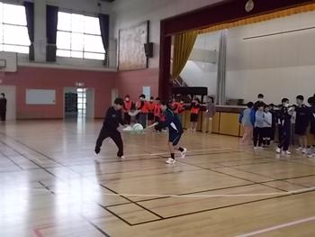 中学生と小学生が力を合わせてボール運びをしました。