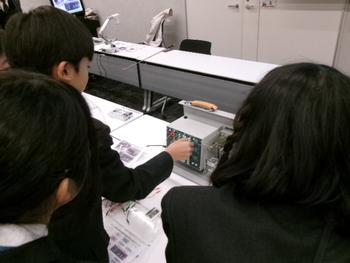 現地に着くと、はじめに本校の科学技術顧問でもある 島添敏之 様が、研修の講師として京三製作所の成り立ちや、世の中から発見する「科学する」ことと、発明をする「技術する」ことについて話してくださいました。そして、実際に1つの機械で電気回路を解析して(科学して)、別の機械に同じようになるように配線する(技術する)研修課題に取り組みました。
