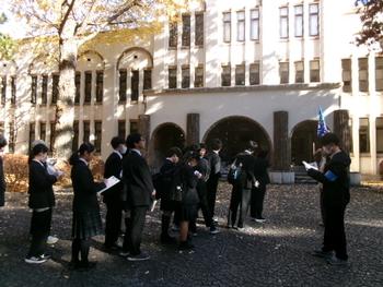 キャンパスに入ると色とりどりの紅葉の木立に囲まれた歴史ある農学部本館の時計台が見えてきました。初めに大学で学ぶ仕組みや農学部と工学部が協働して研究活動を進めてきていることなど東京農工大学の取り組みについてご講義いただきました。