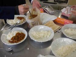2年生の家庭科では、災害時の食事について学習しました。今回は保存食を使った「災害時カレー」に挑戦。ビニール袋に米と水を入れて湯煎し、鯖缶や焼き鳥缶(タンパク質)、カレールーと水も袋に入れて湯煎するだけで調理します。限られた環境でも温かい食事ができる工夫を体験しました。非常時に心と体を支える食の大切さを実感する学びとなりました。