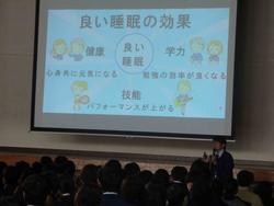 続いて、東洋羽毛工業株式会社の上級睡眠健康指導士・梅田健次様を講師にお迎えし、「自分の睡眠を見直そう」というテーマでご講演いただきました。講演では、睡眠が心と体の健康を守る基本であること、正しい睡眠が成長や学力、運動に良い影響を与えること、さらに自分の睡眠が十分かどうかを確認する方法について学びました。
