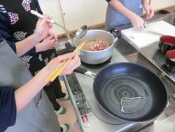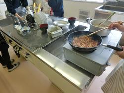 調理実習の様子です。1年生、トン汁としょうが焼き。