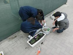 今年度2回目の花植えを1月28日(水)の放課後に、地域活動協働本部の皆さん、本校美化委員会の生徒、担当職員、学校用務員さんが協力して行いました。寒風の中、美化委員会の生徒の皆さんも皆熱心に取り組んでいました。