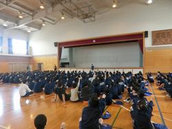 新2,3年生は、教室での新学級の発表後、アリーナにて着任式と始業式。