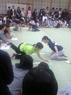 本日の体験は、競技かるたの鑑賞です。最初に競技かるたの説明があり、かるた会の方々のデモンストレーションが行われました。来た方々がすべて有段者ということで、激しい勢いで激しくふるまう「ちはやふる」そのものでした。そして、この有段者の方々と3年生の百人一首大会入賞者との対戦が行われました。さすがに有段者の壁は厚く、厳しい戦いとなりましたが、生徒たちが札を取るたびに、歓声が上がりました。