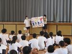 明日の終業式を控え、今学期のまとめの学年集会が開かれました。学年・学級の良さや課題を確認したり、ミニレク大会で盛り上がったり、学年の輪をたしかめる時間となりました。写真は1年生の集会の様子です。