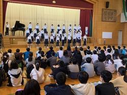 午後の時間を使って、5時間目は中山小と上山小が、6時間目は森の台小の6年生全員が中学校の体育館に初めて入りました。生徒会の司会で進行し、先日行われた合唱コンクールの3年生と2年生の最優秀クラスと優秀クラスの合唱発表を鑑賞してもらいました。