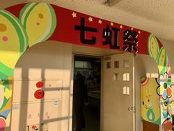 七虹祭1日目の午前は、展示発表見学です。恒例の全校制作は、クラスごとに分担してペットボトルキャップを張り付けたスローガンです。なんと1万6,848個キャプが使われています。展示室のアーチは美術部が作成しました。