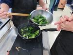 調味液にはみりんも加え、照りのある、いい香りのしょうが焼き。付け合わせの小松菜はグループによって炒めたり、ゆでたりして、味付けも生徒たちに任せました。