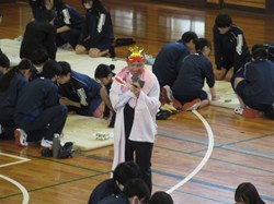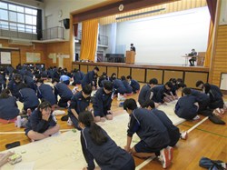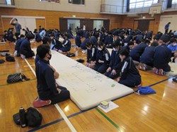 3月19日、2年生の百人一首大会が行われました!真剣に札を取り合います!…読み手が気になりますね。