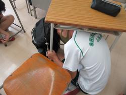 大地震を想定した避難訓練を実施しました。3年生も机の下に潜り込み安全確保をしていますが、体が大きく、頭かくして尻隠せず…。