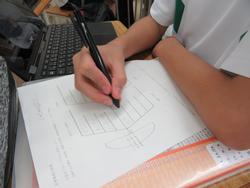 3年生の技術では、自動販売機の動きをフローチャート化してもらいました。映像を何度も見返しながら、人にやさしくしているところを見つけながら、商品を買う流れを考えてもらいました。