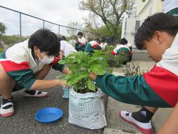 2年技術は、3月から育てているジャガイモの袋栽培の芽かき・土寄せを行いました。芽の厳選が収穫時に大きく影響します。相談しながら茎の太いものを残すようにしています。また、ダンゴムシを捕まえて、袋に入れている生徒もいました。