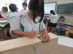 1年技術は、自宅で利用できる製品づくりを始めました。見本をもとにケガキの下書きを作成したあと、さしがね、スコヤを使って材料にケガキを行っています。わからないところは、ロイロノートの資料やグループメンバーに聞きながら進めましょう。